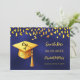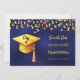 On front: A navy blue background, golden text. The blue color is uneven. Templates for a name and date. The name and the text: Save the Date are written with a modern hand lettered style script. With a faux gold cap, tassel topper.