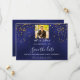 A Save the Date card for a 50th (or any age) birthday party. A navy blue background. The blue color is uneven. Decorated with golden confetti. The text: Save the Date is written with a large trendy hand lettered style script. Personalize and add a photo.