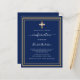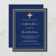 A modern, elegant and invitation. A navy blue background decorated with a golden cross, and frames. Personalize and add a name and details. White text.