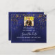 A Save the Date card for a 50th (or any age) birthday party. A navy blue background. The blue color is uneven. Decorated with golden confetti. The text: Save the Date is written with a large trendy hand lettered style script. Personalize and add a photo.