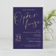Create luxurious business event invites for your house warming or new business party with this modern Open House Invitation. This elegant navy blue and faux gold open house event invitation features a trendy layout with script fonts and space for your logo and event details, perfect to invite guests to your Housewarming Celebration.