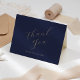 This elegant modern wedding thank you card features the words "Thank You" in stylish gold-colored handwriting script and the names of the bride and groom in sans serif font on a navy blue background.