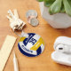 This volleyball themed keychain for boys or girls features the realistic image of a volleyball that has navy blue, gold and white panels, upon which you can customize the player's name & jersey number plus school or club name and mascot name in a varsity letter style font - by katz_d_zynes