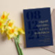 Elegant typography wedding invitation in dark blue with your wedding date in large navy blue numbers down the side of the invitation. Add names and wedding wording in gold foil. Gold foil and dark blue wedding invitation with your names in a large font.