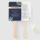 Modern, elegant, botanical gold and navy blue wedding program hand fans, with watercolor greenery and simple calligraphy script.