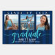 Announce to the world that your favorite grad has reached their milestone. Everyone who passes by will not be able to miss this stunning, simple, modern, girly personalized 3 photo yard sign. Sparkly turquoise glitter script typography overlays a navy blue striped background. Add 3 photos of your choice and personalize the custom text with your graduate’s name, school name and class year. Choose from 3 sizes: small (12”x18”), medium (18”x24”) and large (24”x36”). Matching invites, thank you cards, cap toppers, fans, napkins, plates and other graduation goodies are also available in this trendy and stylish collection. Guaranteed to preserve cherished memories of their special occasion!