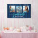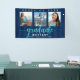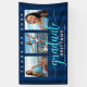 Announce to the world that your favorite grad has reached their milestone with this stunning, simple, modern, girly personalized 3 photo banner. Sparkly turquoise glitter script typography overlays a navy blue striped background. Add 3 photos of your choice and personalize the custom text with your graduate’s name, school name and class year. Choose from indoor or outdoor options. Matching invites, thank you cards, cap toppers, fans, napkins, plates and other graduation goodies are also available in this trendy and stylish collection. Guaranteed to preserve cherished memories of their special occasion!