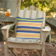 Stylish and chic square outdoor accent pillow design features a vibrant striped design in navy blue, kiwi green, tangerine orange, coral pink, and soft white colors.