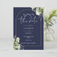 This elegant navy blue botanical greenery floral gold arch save-the-date invitation can be personalized with your information in chic typography with your wedding website QR code and details on the reverse. Designed by Thisisnotme©