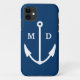 Navy blue iPhone case with boat anchor monogram. Nautical anchors aweigh gift idea for sailors. Maritime theme.