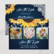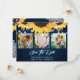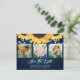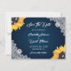 Rustic navy blue floral wedding photo save the date cards featuring sunflowers and white floral lace on a navy gradient background. Easily personalize this card with your images and wedding details. Matching items available. The background may be changed to any color.