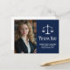 Elegant navy blue lawyer thank you postcards with the scales of justice next to your graduation or office photo. Customize these law school postcards of thanks with chic white script next to your attorney photograph.