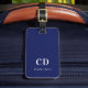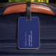 Navy blue faux leather print as background. Personalize and add your monogram letters and full name on the front. Your contact information on the back. White text.