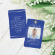 A navy blue background, a faux gold frame and space for your photo. A golden cross. Light beams, behind the photo. Personalize and add name, dates and your text and prayer.