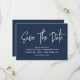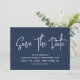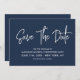 Modern calligraphy save the date in navy blue with a digital scannable QR code for a website or contact information on the back.
