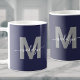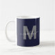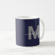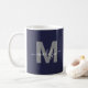 Personalized Modern Navy Blue and White Initial Script Name Monogram Coffee Mug. This sleek monogram mug combines a modern minimalist style with a simple yet stylish look, perfect for any coffee or tea lover. Featuring a bold gray initial on a navy blue background and a white script name, this mug has the monogram displayed on both sides, giving it a personalized touch from every angle. Ideal for home, the office, or as a thoughtful gift, it’s crafted with classic sophistication and clean typography. A great choice for birthdays, housewarmings, holidays, or just because, this chic mug adds a stylish, personal element to anyone’s day!