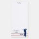 This distinctive golf themed refrigerator to do list features a navy blue silhouette golfer in full swing. On the lower third is your monogram in matching blue framed by thin red lines. The text reminds you "...but first, GOLF". The text and image are placed on a white background.
