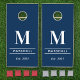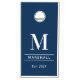 A bold navy blue monogram cornhole set featuring a large white single initial with your family name and established year in crisp white typography. The deep navy background and clean lines create an elegant, polished look for your wedding reception or backyard entertaining. A striking keepsake and a perfect gift for the couple. All text is fully editable.