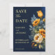 Dark Navy blue moody rustic sunflowers wedding save the date invitation, summer fall wedding save the date blue and yellow themed wedding