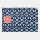 A navy blue and white moroccan inspired pattern with a coral orange monogram square to customize with your initial.