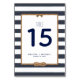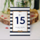 Nautical Boutique Co.'s modern nautical event / wedding table number design features a rope tied into an infinity knot and traditional block typography paired with modern handwritten typography. The design is set on a matching watercolor background in navy blue and white stripes. #Nautical #CoastalWedding #Wedding #BeachWedding