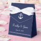 Navy blue nautical wedding favor boxes (tent favor box with white ribbon) with anchor and customizable text - you can add bride's and groom's name and wedding date.
