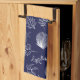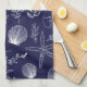 This kitchen towel features a repeating pattern of white hand-drawn sea shells, starfish, sand dollars and seaweed over a navy blue background. Perfect kitchen accent for a seaside retreat.