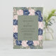 Deep navy blue and soft blush pink combine for a sophisticated and moody aesthetic. Hand-painted watercolor peonies and delicate eucalyptus leaves are arranged in a lush display. This design features organic botanical details and rich textures surrounding a calming sage green background, perfect for a romantic and elegant seasonal event.