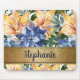 Trendy and modern orange and navy blue tiger lilies / watercolor floral mousepad, personalized with your name written in an elegant script font on a gold band.
