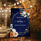 Orange and white roses sage eucalyptus greenery navy blue background gold geometrical frame floral personalized name wedding welcome sign board.