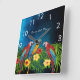 Tropical birds, parrots in blue, yellow and red sitting on green palm leaves. Decorated with tropical flowers. A dark blue sky as background. The blue color is uneven. Template for a the name of your house, beach house, vacation home or your family name. White hand lettered style script. Clock numbers from 9 to 3.