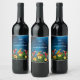 Labels for the wine of hour home, house wine! Tropical birds, parrots in blue, yellow and red sitting on green palm leaves. Decorated with tropical flowers. A dark blue sky as background. The blue color is uneven. Template for a the name of your house, beach house, event place and a year. White hand lettered style script. Template for an event: birthday party (any age) bridal shower, weddings, wedding anniversary.