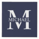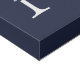 featuring personalized white monogram in classic serif font style with box of name in the middle of monogram on navy blue background.