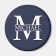 featuring personalized white monogram in classic serif font style with box of name in the middle of monogram on navy blue background.