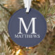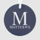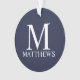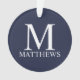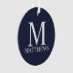 features personalized monogram and name in white classic serif font style on navy blue background.