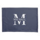 featuring personalized white monogram in classic serif font style with box of name in the middle of monogram on navy blue background.