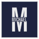 featuring personalized monogram in white bold modern sans serif font style with box of name in the middle of monogram on navy blue background.