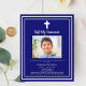 A navy blue background, decorated with a white frame, and a white cross Personalize and add a photo name and details. White text.