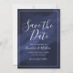 This simple and elegant Save the Date wedding invitation features a navy blue watercolor background with white fonts and a white frame. The design allows you to customize the colors, as the watercolor sits atop the colored background. At the top, "Save the Date" is prominently displayed in large and bold script calligraphy, complemented by classic serif typography and script accents for the rest of the text. A thin white line frame around the edge adds a touch of sophistication. On the back, there is a spot for an engagement photo with a black and white filter, which you can change in the editing tool, or you can choose to remove the photo, leaving a pretty watercolor design. This modern, minimalist invitation is perfect for any season, including spring, summer, autumn, fall, and winter, with a particular emphasis on fall and winter. Its chic and understated elegance makes it a versatile choice for any wedding theme, including nautical and celestial themes, adding a touch of class to your special day. Simple Stylish Elegant Navy Blue Watercolor Save the Date Wedding Invitation. Available as a printed invitation, or as a downloadable digital invite that you can send in e-mail or have printed locally!