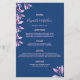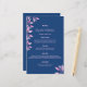 An elegant and trendy floral wedding menu card. Personalize and add your names, date and the wedding menu. Blue background decorated with pink botanical sprigs and foliage. Your names are written with a modern hand lettered style script.