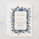 This design features a lush arrangement of navy blue roses and botanical leaves accented by shimmering metallic gold foliage. Dark florals and greenery surround the center against a cream background, creating a sophisticated and moody aesthetic. The composition provides a regal and timeless feel perfect for a formal winter or autumn event.