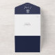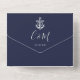 All in one wedding invitation featuring a ship's anchor, signature style names and monogram initials on a navy blue background. The invitation includes a perforated RSVP card with your wedding website QR code. Designed by Thisisnotme©
