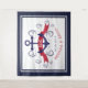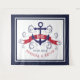 Navy-blue and dark-red nautical boat anchor and elegant blue swirls. Dark red banner for custom wedding monogram.