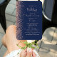 This elegant, modern wedding program fan features a navy blue background edged with rose gold faux glitter. The text appears in elegant rose pink handwriting and copperplate fonts.