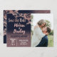 Elegant, chic, and simple modern faux printed rose gold glitter, flowers, and typography on fashionable navy blue background, Save-the-Date wedding card. This classic and sophisticated design is perfect for the trendy and stylish marrying couple. Personalize with your own message on the front as well as a customized monogram initial on the back. All photo print design.