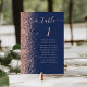 The left-hand edge of this elegant modern wedding table number card features a rose gold faux glitter border. The word "table" appears in rose pink whimsical handwriting script on a navy blue background. Add the names of your guests who are assigned to each table.
