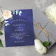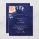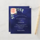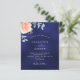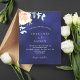 Navy blue background, the blue color is uneven. Decorated with a rose gold and blush pink floral, rose flower and green watercolored eucalyptus leaves, sprigs, greenery and faux gold sprigs. Personalize and add your names and wedding details.