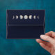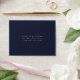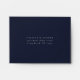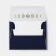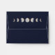 Return address, rsvp envelope. Envelope color, shown in trendy navy blue, can be customized. Envelope features, elegant watercolor gilded moon phases on back flap and inside lining.