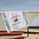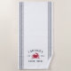Customize your shore house or beach house with this cute personalized beach towel featuring your family name or house name and year established in navy blue lettering accented with a red crab illustration on a white background.