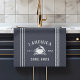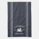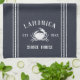 Customize your shore house or beach house kitchen with this cute personalized towel featuring your family name or house name and year established in white lettering accented with a crab illustration on a navy blue background.
